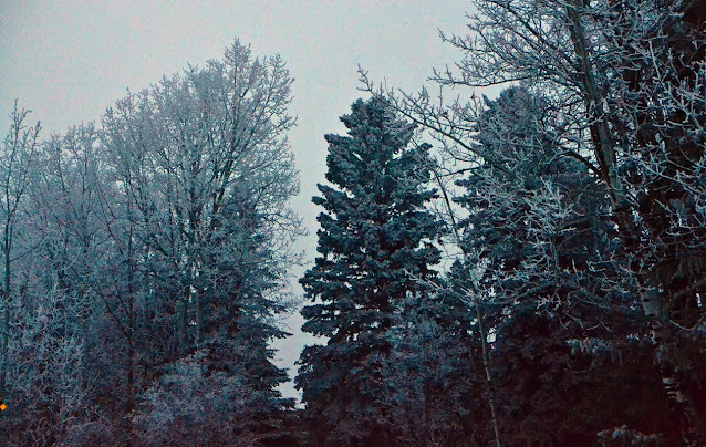 Some recent days of fog led to rime-- the kind of frost formed by fog freezing, vs hoar frost which is moisture freezing out of the air as temperatures drop. The frost quickly falls from trees if temperatures rise near/above freezing, and/or when sun falls directly on frosted surfaces. A few days of cloud and fog at times, with snow in the mix, meant the frost conditions lasted a while (still hanging on along the north edge of woods). These are some of my favourite views of the year- trees become white, distances soft edged, as though we inhabit an entirely new landscape! Views from the acreage, farm, across the neighbours', and from the road.
